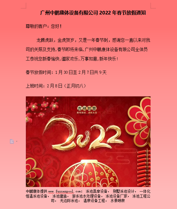 廣州中鵬康體設備有限公司2022年春節放假通知